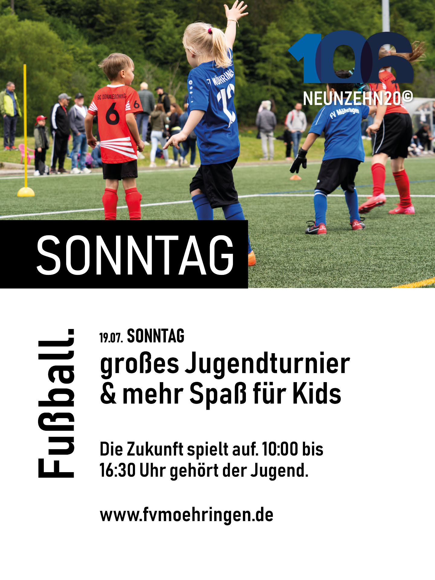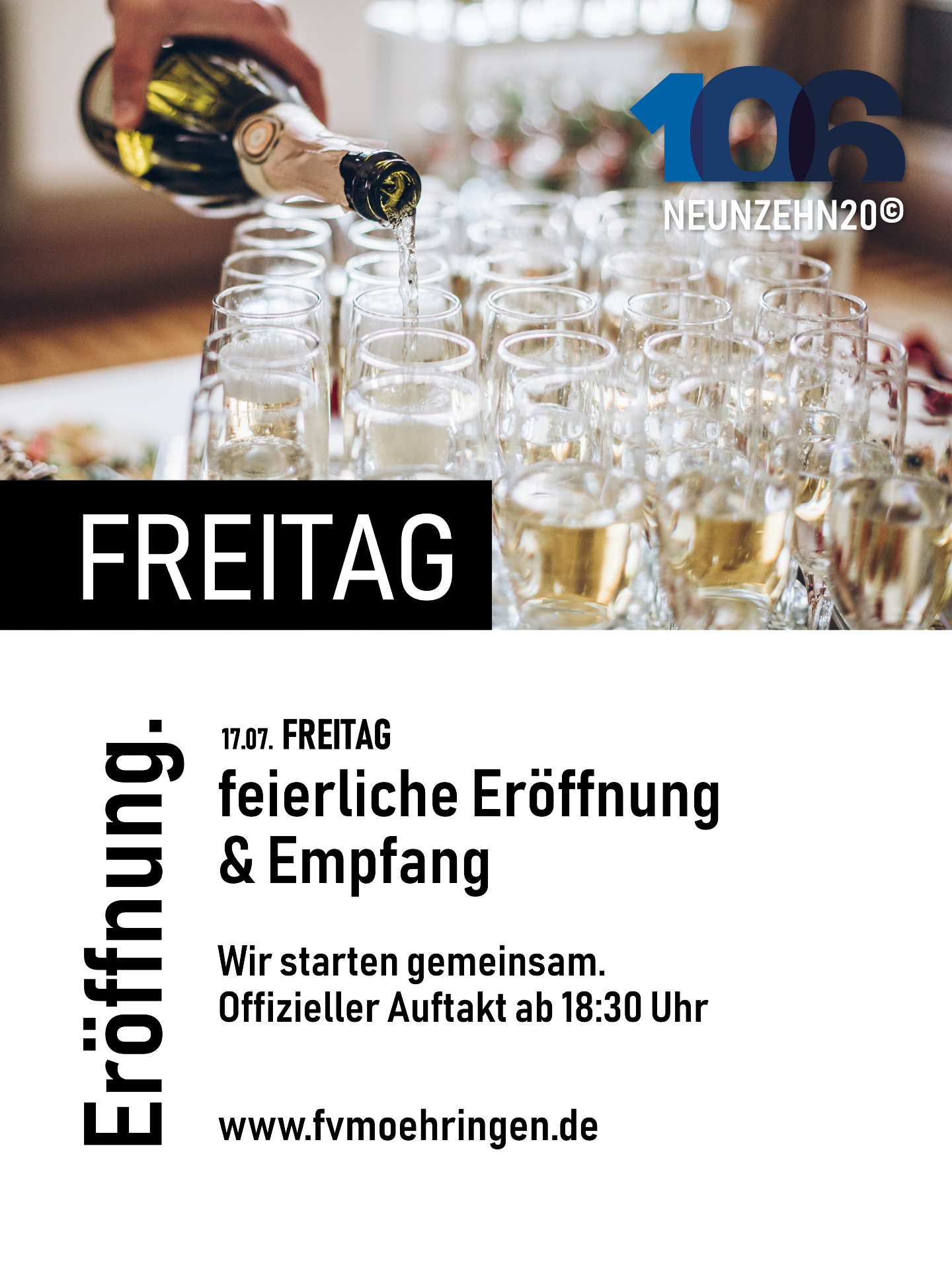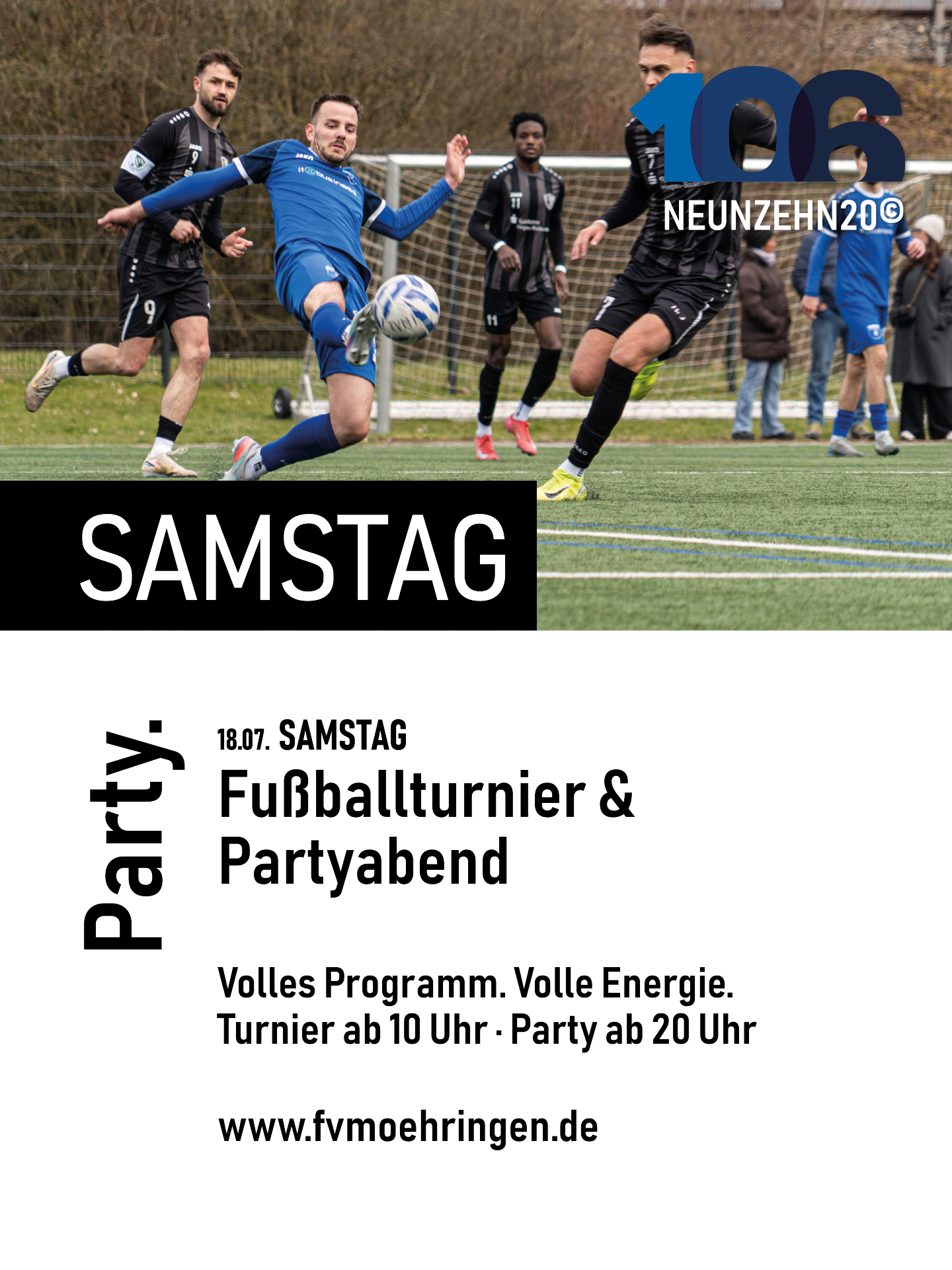 Der FV Möhringen 1920 e.V. lädt dich vom 17. bis 20. Juli zu vier Tagen voller Fußball, Stimmung und Jubiläumsfeeling ein. Freu dich auf ein abwechslungsreiches Festwochenende mit spannenden Turnieren, bester Unterhaltung und vielen Highlights für Groß und Klein.